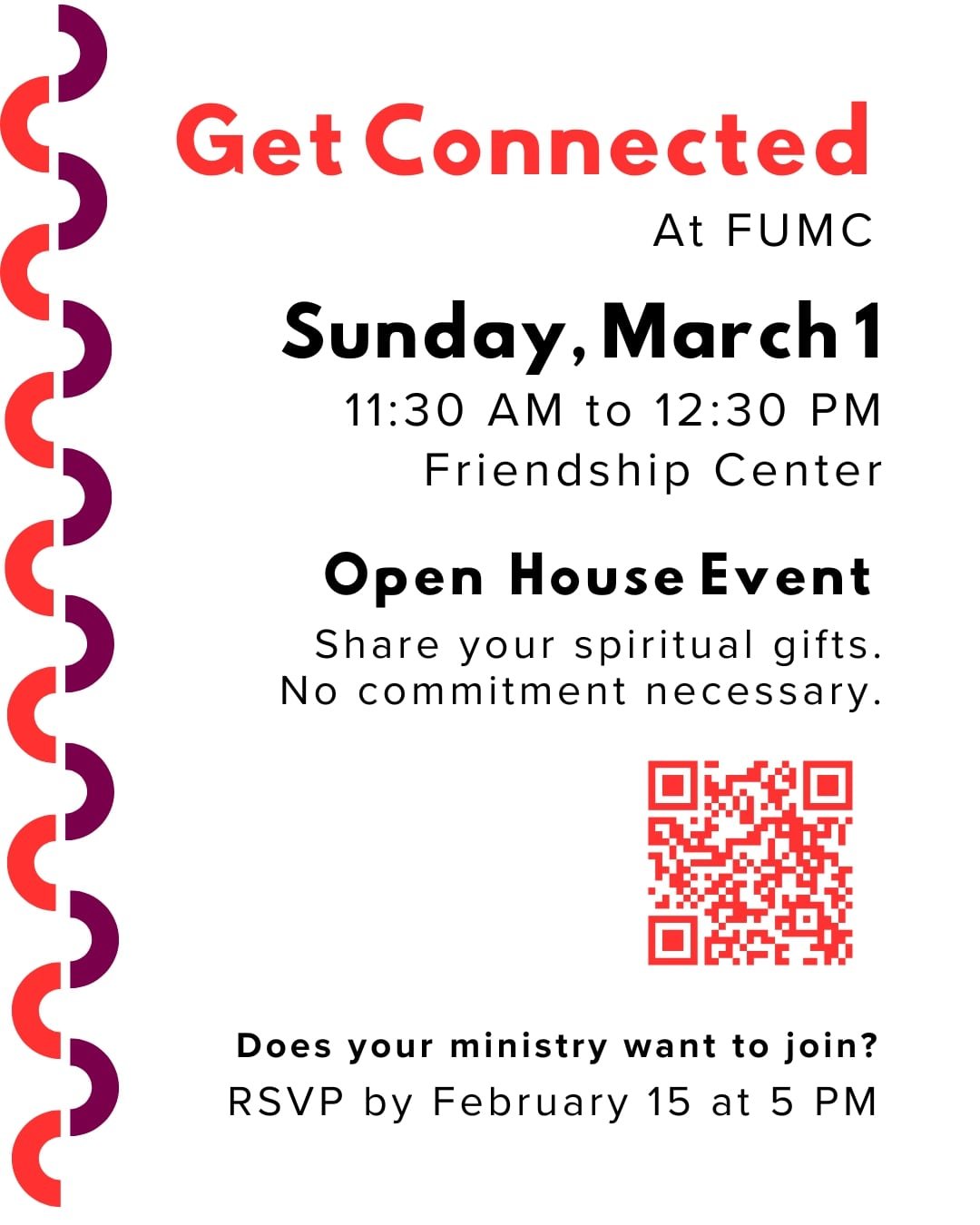 Have you ever wanted to get more involved at FUMC, but don't know the many opportunities available at our church? Attend the Get Connected at FUMC event on Sunday, March 1, in Friendship Center from 11:30 a.m. to 12:30 p.m. This event is open to all and is the chance for you to meet with representatives from various ministries and learn more about outreach and volunteer opportunities. This is an open house, no commitment is necessary but bring an open heart and an open mind.